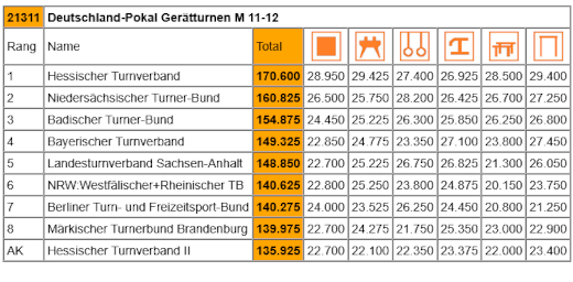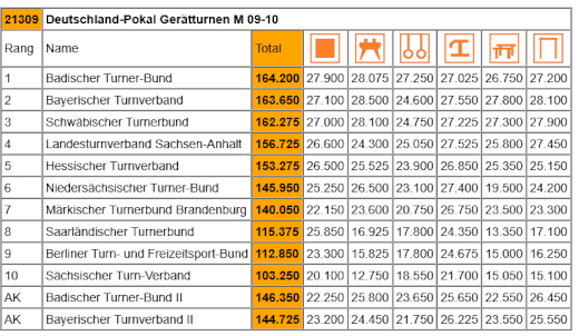 Der Pokaleinstieg bei diesem nationalen Vergleich bei den jüngsten Talenten der AK 9-/10 gelang in diesem Jahr dem BADISCHEN Turner-Bund am besten, wenn auch nur knapp vor den Verfolgern vom Bayerischen Tunverband, die wie im Vorjahr in Schwäbisch Gmünd schon Zweiter hinter den Hessen waren. Die fielen hinter der bronzenen Riege des Schwäbischen Turner-Bundes und hinter dem LTV Sachsen-Anhalt diesmal auf Rang 5 zurück.