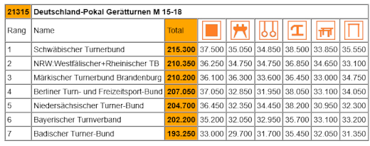 Vorjahressieger NRW/Rheinischer Turnerbund musste sich diesmal dem SCHWÄBISCHEN TURNER-BUND beugen: Die Schwaben holten mit 215,300 Punkten diesmal die begehrte Trophäe und verwiesen die Pokalverteidiger auf Rang 2, und das immerhin mit einer stolzen +5-Punkte-Differenz!