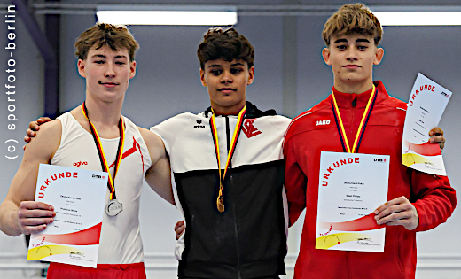 mit 58,550 Punkten, gefolgt von Oleksil Horbulia (57,675) und von Noah Noel Föllner (56,550) vom gastgebenden SV Halle, der sich Bronze punktgleich mit Roman Smolovychenko vom Hessischen Turnverband teilt. Die Tageshöchstwertung dieser Altersklasse erzielte am Pauschenpferd Jan Felix Hermann (NTB) mit 10,900 Punkten.